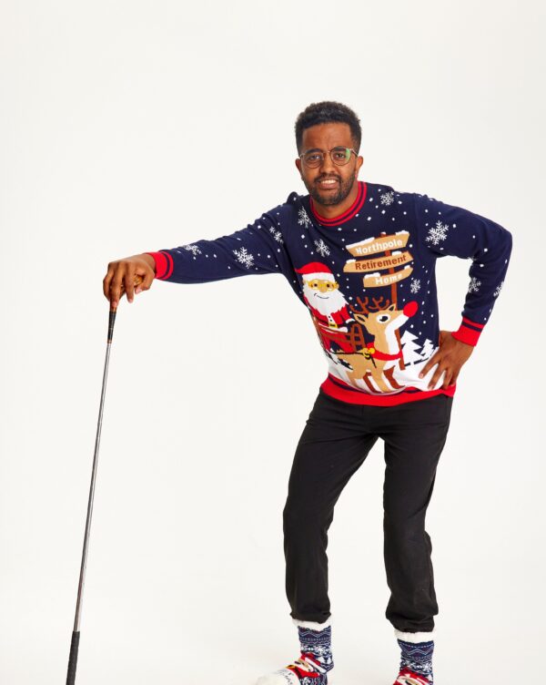 Årets julesweater: Santa’s Retirement Home – herre / mænd. Ugly Christmas Sweater lavet i Danmark