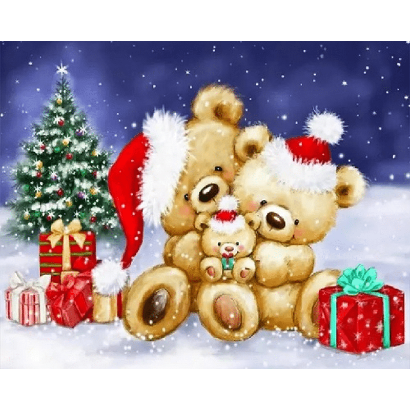 En bamsefamilie med nissehuer på krammer, omgivet af sne og gaver.