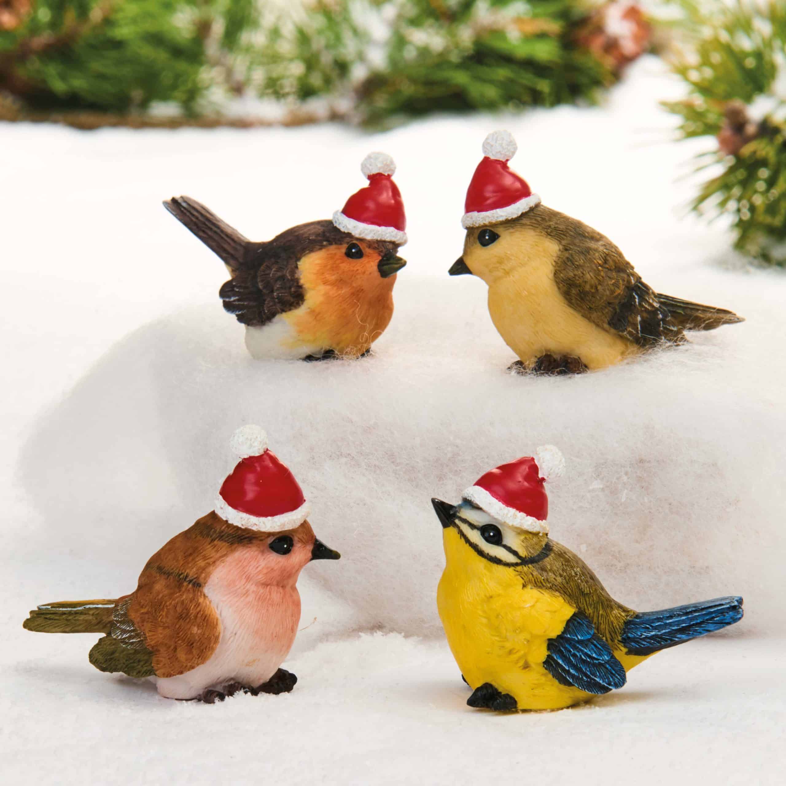 Fugl med nissehue i forskellige fuglevarianter. Måler 6 cm i højden. Fremstillet i polyresin.Pakket med 1 stk.