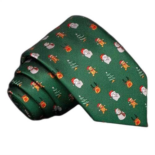 Grønt juleslips med julefigurerSkab den perfekte julestemning med dette elegante grønne juleslips, håndlavet i eksklusiv silke. Slipset er dekoreret med et festligt mønster af klassiske julemotiver såsom snemænd, juletræer, julenisser og peberkagemænd –