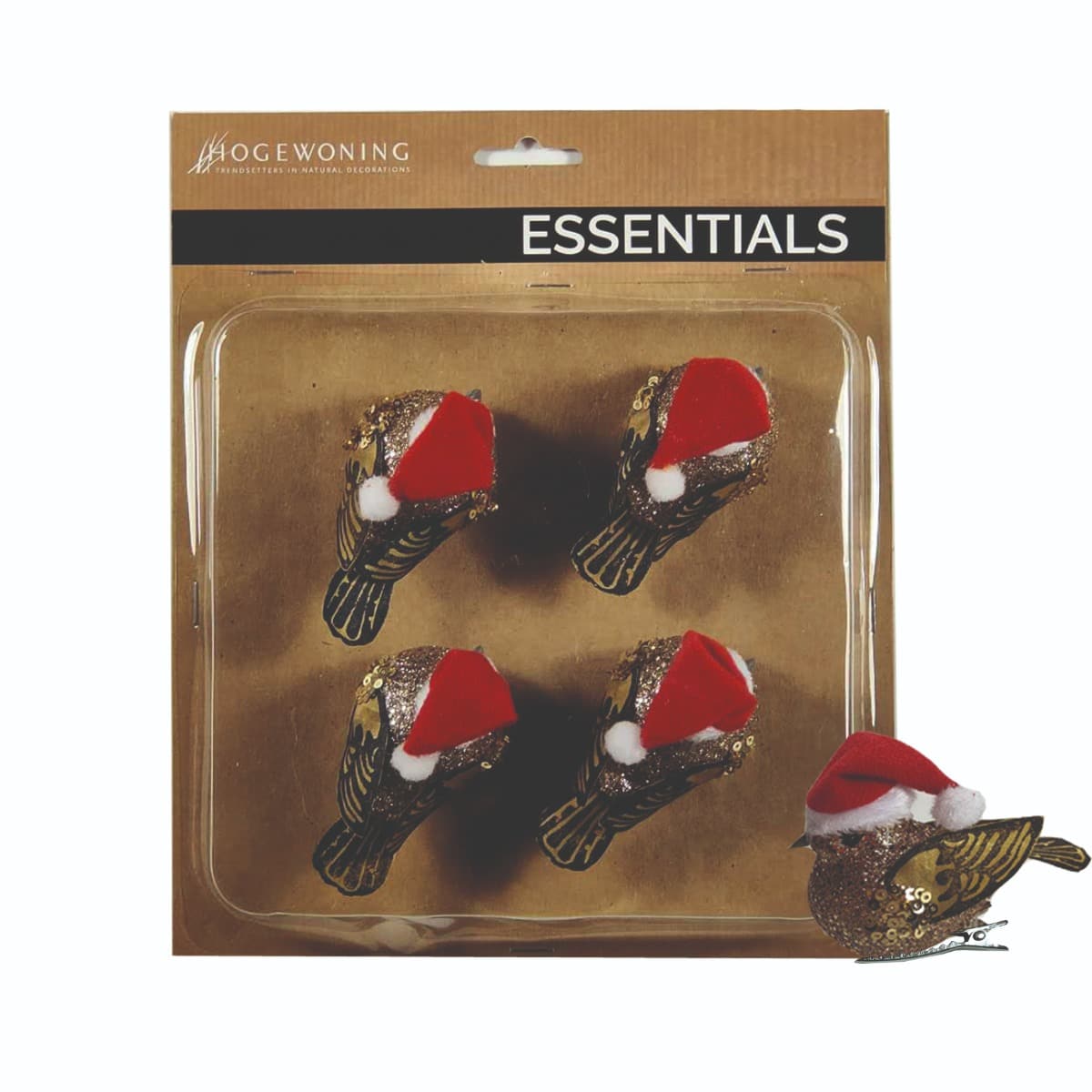 Fugle i glimentende guldfarve med pailetter samt nissehuer på. Fuglene er med klips, så de fx let kan sættes fast på grene, kranse, pakker eller i dekorationer.Mål:Længde: 8 cmFremstillet af styropor, polyester mv.Pakket med 4 fugle i en æske.