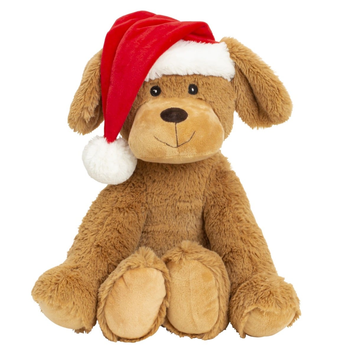 Blød og sød, brun plyshund med nissehue på. En ny bedste ven er klar til at gøre dig eller én du har kær selskab i sofaen. Mål:Højde: 35 cmFremstillet af stof mv.Pakket med 1 stk.