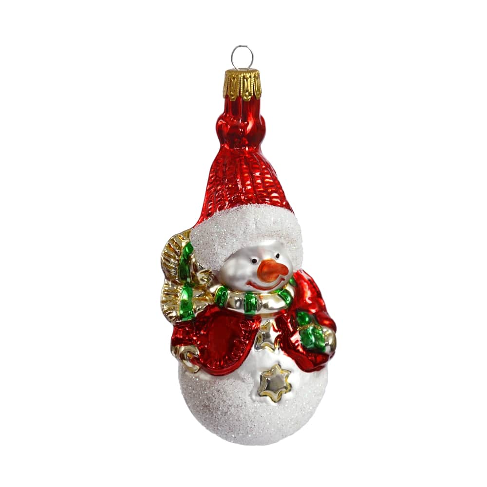Detaljerig julekugle, der forestiller en snemand med nissehue og halstørklæde. Julekuglen er mundblæst og håndmalet hos det sydtyske glaspusteri Thüringer Weinachten. Figurkugler på grene og juletræer er skønne blikfang mellem de klassiske julekugler.Mål: