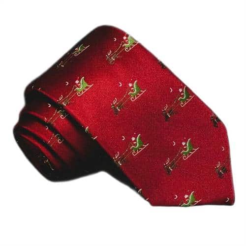Julemanden i sin kane – mørkerødt juleslipsGør din julegarderobe komplet med dette elegante og festlige røde juleslips, håndlavet i luksuriøs silke. Slipset prydes af et detaljeret mønster med julemanden i sin kane, trukket af rensdyr – et klassisk og c