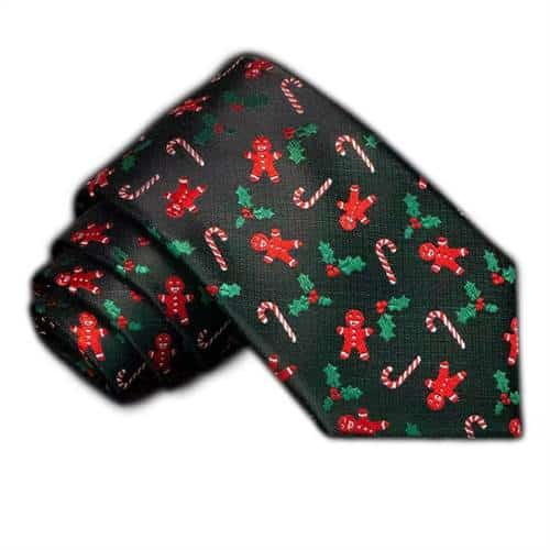 Sort juleslips med julefigurerBring julestemningen helt i top med dette elegante og festlige juleslips. Slipset er dekoreret med et charmerende mønster af små peberkagemænd, kristtornblade og julestokke som giver et både sjovt og hyggeligt udtryk. Med en