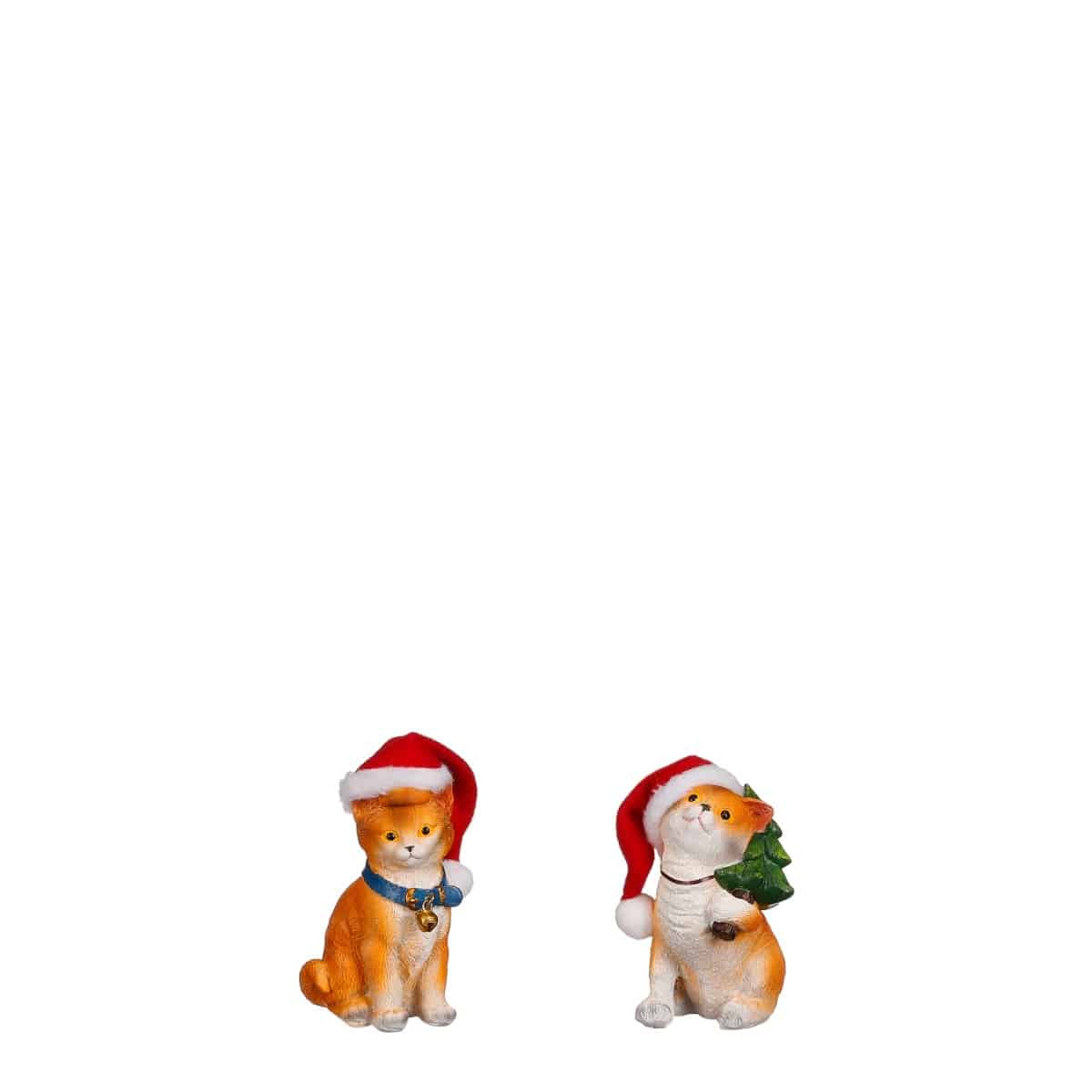 Små, skønne rødbrune katte med halsbånd og tydelig pelsstruktur. Begge varianter er med bløde nissehuer. Mål:Længde: 6,5 cmBredde: 5 cmHøjde: 10 cmFremstillet i polyresin.Pakket med 1 stk.