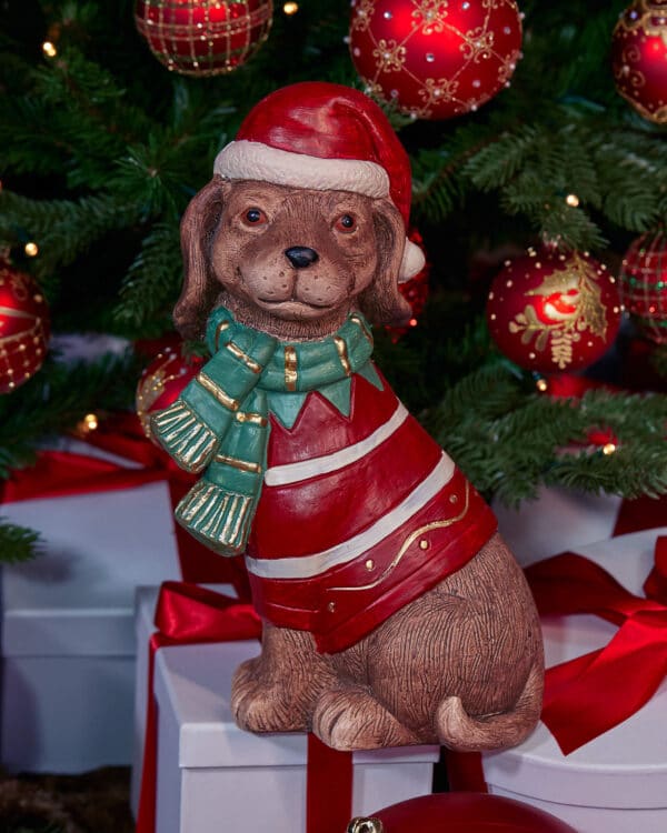 Murphy hund juledekoration er den trofaste juleven, der spreder glæde og varme i hjemmet. Klædt i rød trøje, grønt halstørklæde og nissehue udstråler han venlighed og julestemning. En charmerende figur, der passer perfekt på reolen, i vindueskarmen eller ved juletræet.