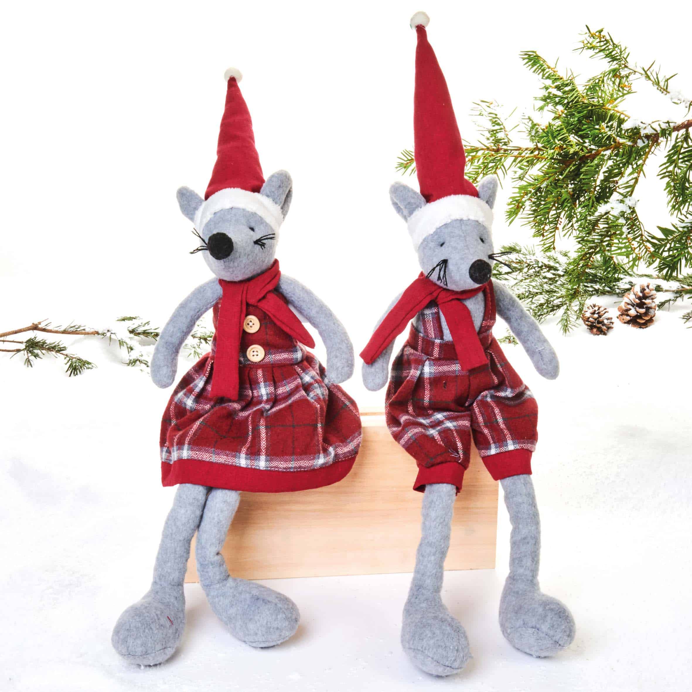 Mus med hængeben, røde nissehuer, halstørklæder og skotskternet tøj. Musene måler 50 cm og findes i musepige og i musedreng.Pakket med 1 stk.