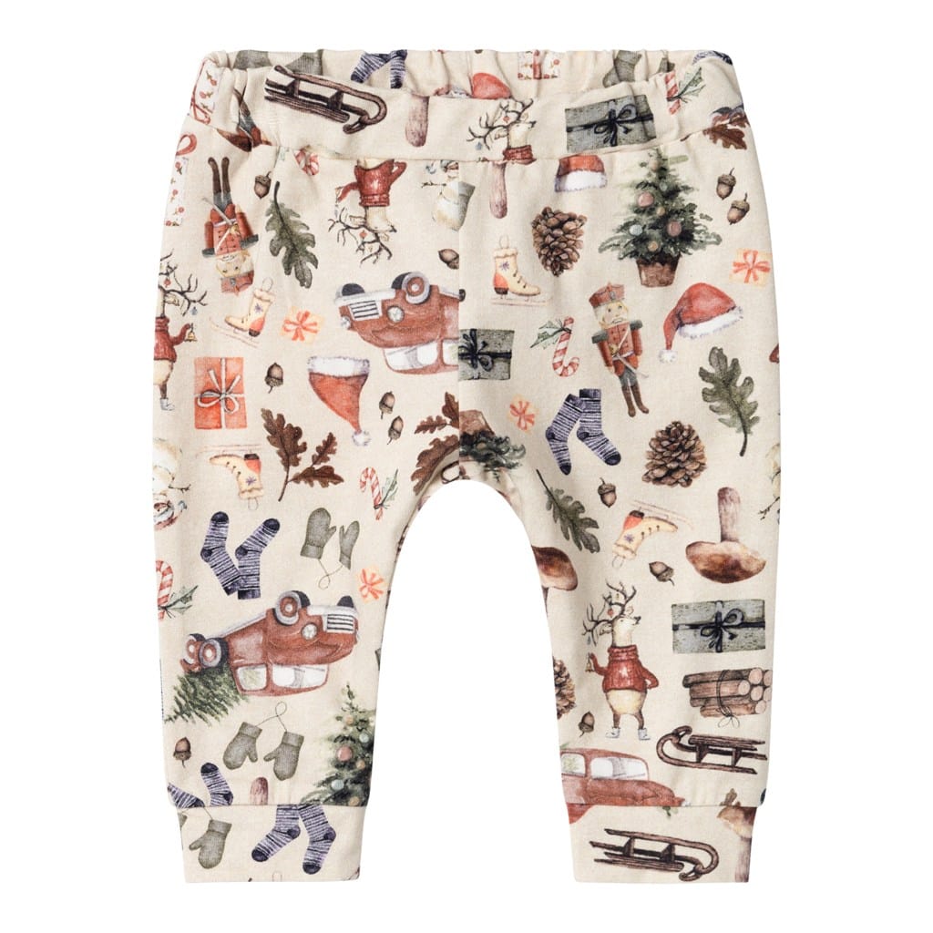 Sødeste jule baby bukser fra Name it. Bukserne er med det skønneste jule print med både grankogler, nissehuer, juletræer og en masse andre fine jule sager.