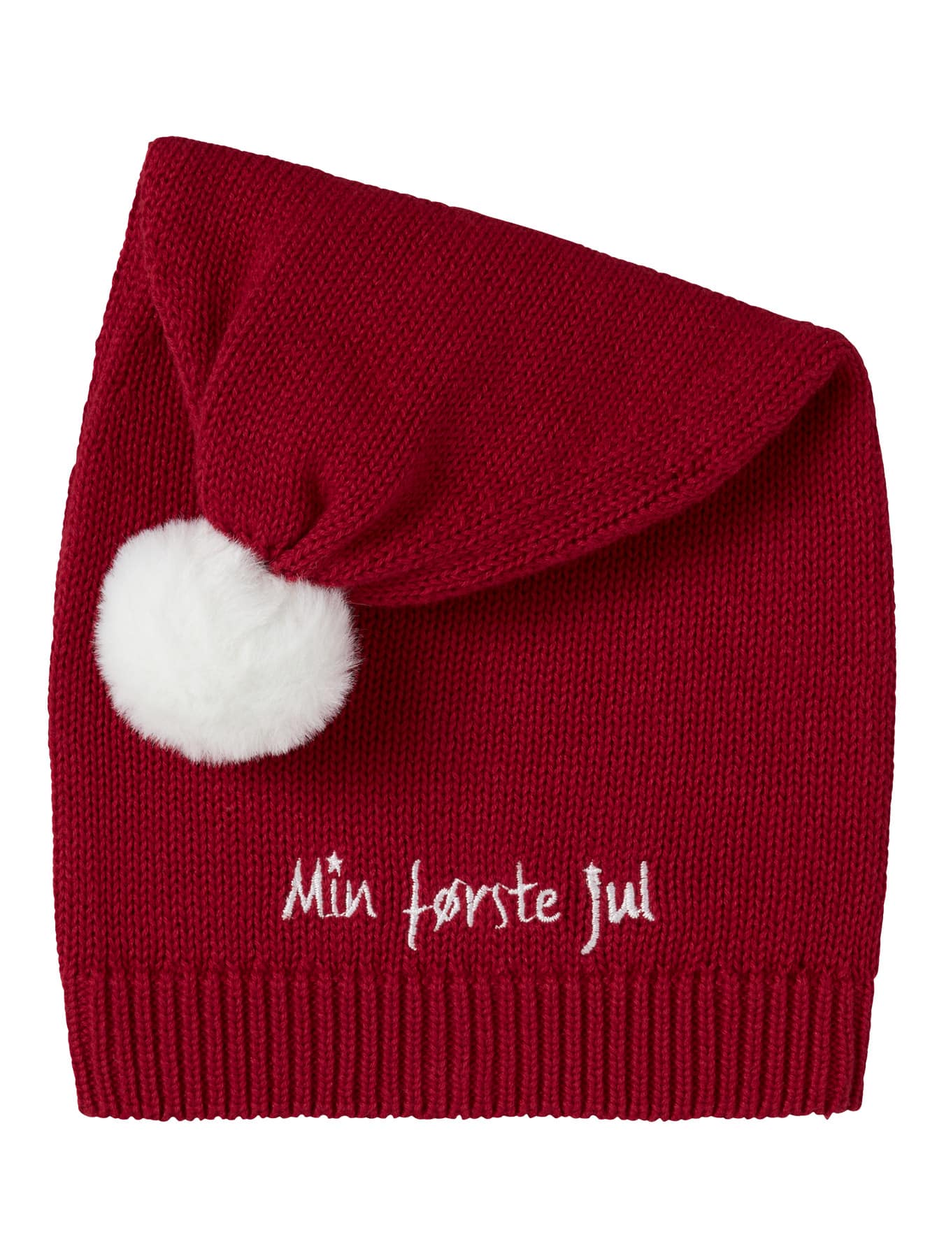 Mega flot strikket nissehue fra Name It med en hvid kvast på toppen. Ribbet kant nederst og super blød kvalitet. Min første jul.