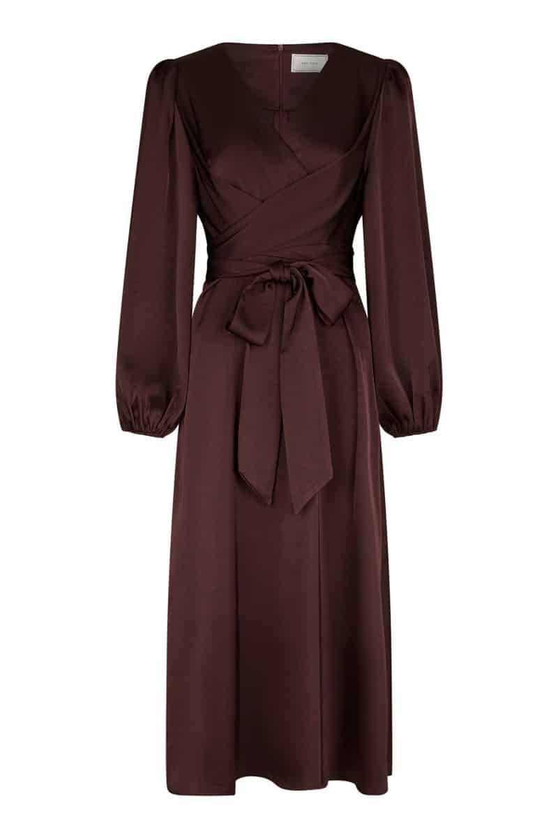 En utroligt smuk og elegant kjole fra Neo Noir i den flotteste mørke røde farve. Kjolen falder super smukt med sit fine snit. Den har udtrykket af slå-om med sit bindebånd i livet, men er egentlig syet sammen i taljen – super smart! Denne kjole er helt pe