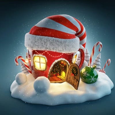 Sødt lille nissehus på sne og med en nissehue ovenpå.