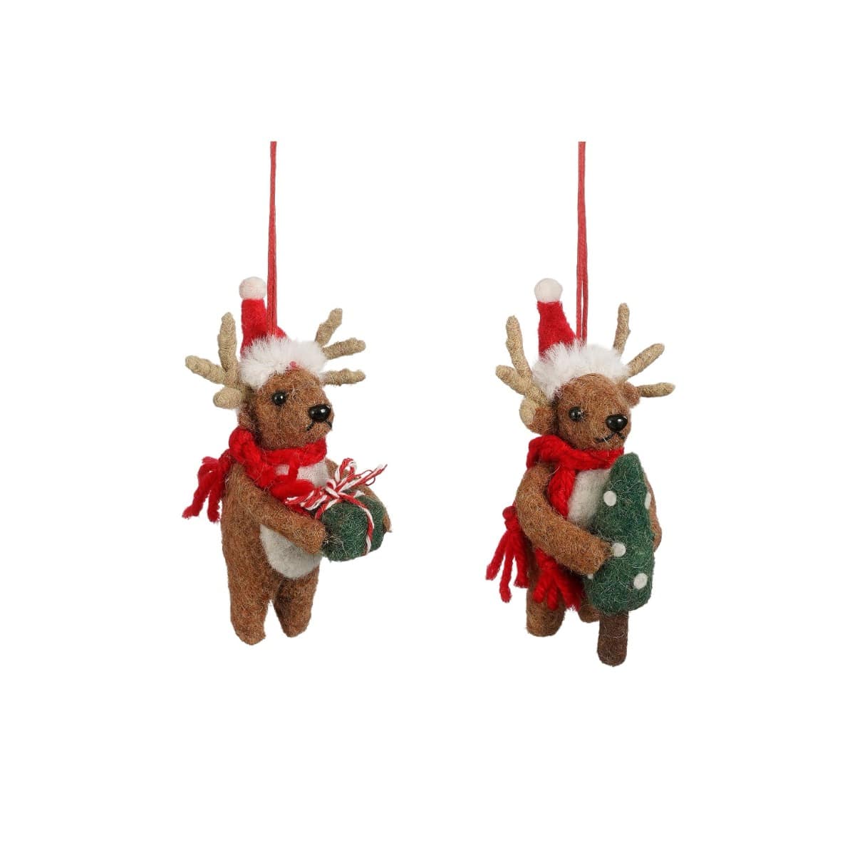 Små filtede rensdyr med røde halstørklæder, nissehuer og snor til ophængning. Fås med juletræ eller gave. Kan fx hænges på juletræet.Mål:Længde: 5,5 cmBredde: 12 cmHøjde: 4,5 cmFremstillet af filt.Pakket med 1 stk.